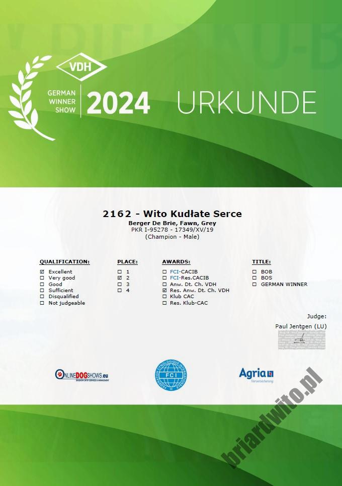 Sędzia: Paul Jentgen (LU) Klasa: Championów Lokata: 2/2 dosk, Res. Anw. Dt. Ch. VDH = Anw. Dt. Ch. VDH Wito zdobył pierwszy wniosek do tytułu championa Niemiec VDH